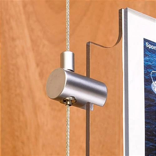 This sign holder, cable panel clamp is the most space-saving way for you to display your advertisements or window displays. This satin finish cable panel clamp is a lateral panel support for the cable display systems. It is designed to secure and hold the accessories steadily together. This sign holder, cable panel clamp provides you with lots of display possibilities. It can be used to hold poster frames, literature displays, and brochure pockets. Use this cable panel clamp to advertise any new products or special promotions on the store front window to attract the attention of passersby. This cable panel clamp, also known as a sign clamp, can hold material up to 5/16″ in thickness.