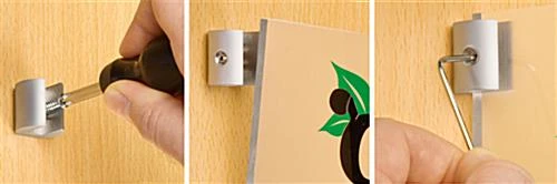 There are many reasons this sign support is preferable over other brackets. First, the 90° angle these sign supports hold acrylic signage at is highly visible. Unlike brackets that hold signs flat against a wall, these displays position signage directly in a patron’s line of site. This makes the sign support ideal for displaying an acrylic sign providing directions, in addition to advertisements. Additionally, these brackets are small. Many wall mounted brackets are bulky and detract from the signage they display. You don’t have to worry about that with these displays. This set of signage brackets accents signs in a subtle and sleek way that will not detract from your acrylic sign.