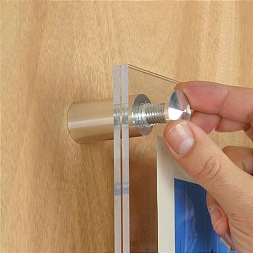 The sign mounts fit into 1/2″ holes drilled through your panels. All the mounting screws and wall anchors are included with your purchase, as well as mounting instructions to help you along the way. The standoff caps are then hand-tighted to secure the whole assembly to the wall. Our sign mounts can support panels up to 3/4″ thick. Display vibrant graphics in an orderly fashion with these attractive standoffs!