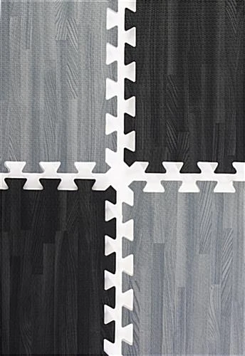 These black & gray wood grain floor mats are a unique way to accent your trade space with high-quality commercial flooring. This set of 26 soft EVA foam tiles is super easy and fun to assemble. The 2’ x 2’ interlocking foam floor mats fit together like a jigsaw puzzle to form a 10’x 10’ cushioned area of dynamic flooring. The tiles are engineered for long lasting durability and high traffic situations, yet they’re soft enough to create the right amount of extra comfort for whoever stands on it. Each set comes with detachable side pieces of interlocking foam that allow you to create your own sized area. These wood grain floor mats make your trade show or retail area look more professional and appealing while also creating a noticeably more comfortable atmosphere for you, your customers and staff.