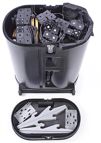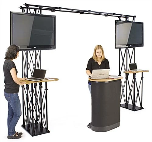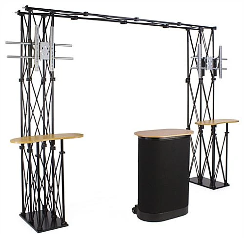 This portable booth display, trade show booth is great for creating an interactive exhibit that will draw customers into your business. Vivid imagery and large televisions easily draw in customers. A portable trade show display can hold an up to 60″ plasma or LCD TV that weighs up to 80 lbs. You can display each television either in landscape or portrait orientation, and use the spacers on each truss to raise your television 3″ on this trade show display. A portable booth displays, like portable booths and an pop up exhibit displays, all fit into traveling cases with wheels to easily transport your display to and from events. A countertop and black wrap are included so you can turn this travel case into a sale counter!