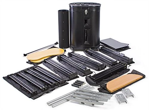 These portable booth displays have (2) 31″ wide counters on each side of these displays. These counters are ideal for displaying additional information brochures, or you can present in front of the television from one of these counters. These portable booth displays, trade show booths have an almost 8′ x 8′ area to place a custom graphic along the back. Use this banner graphic to draw even more attention to your booth. A trade show display uses a modern truss design with a black finish that brings a stylish appearance to your business. We include this trade show display with instructions for easy assembly, as well as repacking the unit into the travel case!