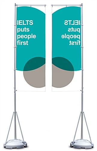 An innovative aspect of these promotional displays is that they only require one person for setup. These custom flags and banners are equipped with telescoping flagpoles made from aluminum that collapse for compact storage. Graphics can be fastened to the flagpoles while at the ground level. Then each section of the pole is moved up and locked in place. The horizontal armature keeps signs taut and readable. This flag arm also pivots with the wind to handle gusts while simultaneously creating attention-grabbing movement. At the base of the flag pole, there is a 3-leg support mounted to a plastic polymer base. Each base can be filled with water or sand to enhance the unit’s stability. The bottom support also fits effortlessly into the provided carrying bag while in transit.