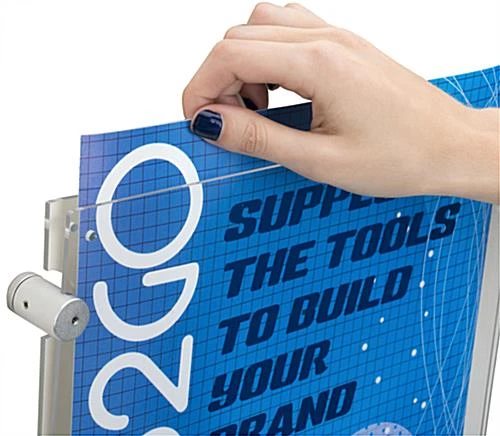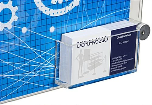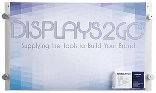 This 17” x 11” sign holder with calling card pocket is a horizontal wall mount display manufactured from clear acrylic. Complementing the durable and sleek frames are 4 silver edge grip standoffs which provide functionality without detracting from the advertisement. Installation hardware is included to complete the wall mount process for each horizontal sign holder. Insert print art into the acrylic sleeve and secure with button magnet closures. Ideal for real estate offices, doctor waiting areas, university lobbies, or recreation hall entrances, these two in one frames provide a display for marketing posters and contact information listings all at once. Purchase a sign holder that is durable and high quality today from Displays2go!