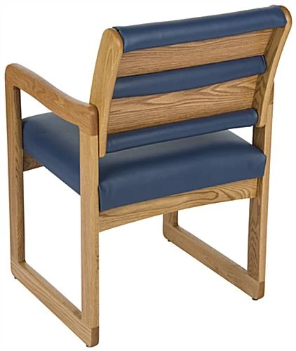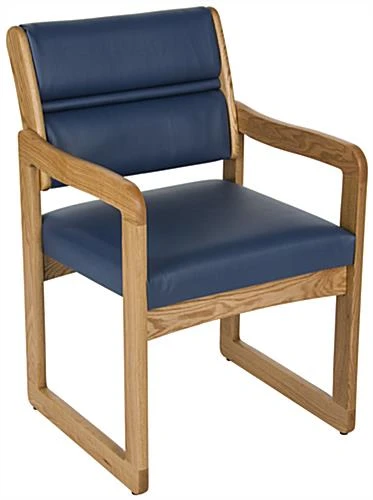 The blue reception room chair is the ideal solution for your businessโ waiting area. The furniture features a medium oak wood finish with a vinyl seat and back for your comfort. The wooden reception room chair is extremely easy to set up by simply aligning the side arms to the cushions with the attached slide on brackets. When assembled, the waiting area furniture is highly durable and can withstand a max support weight on the seat and back of 400 pounds. The chair offers a contemporary style which is perfect for coordinating with existing dรฉcor. Your floor space will look great with these units and provide your customers an appealing place to sit and relax!