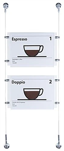 These hanging signs, also known as cable displays, are perfect for businesses looking for relatively low cost signage that grabs the attention of the customer. This kit includes custom designed satin silver finished hardware for an elegant look to blend well with any environment. These suspended signage kits, hanging signs include a crystal clear acrylic panel with a simple to use top-insert design. Users can quickly switch out marketing materials according to business needs. These hanging signs are part of a large of selection cable kits in all different sizes and configurations. Purchasers can choose a pre-designed set or create a unique matrix by combining multiple different kits.