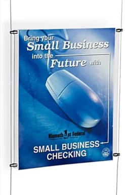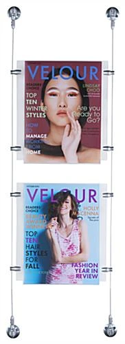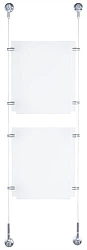 This wall mount poster, also known as cable displays, is perfect for businesses looking for relatively low cost signage that grabs the attention of the customer. This kit includes custom designed satin silver finished hardware for an elegant look to blend well with any environment. This suspended signage kit, wall mount poster includes a crystal clear acrylic panel with a simple to use top-insert design. Users can quickly switch out marketing materials according to business needs. This wall mount poster is part of a large selection of cable kits in all different sizes and configurations. Purchasers can choose a pre-designed set or create a unique matrix by combining multiple different kits.