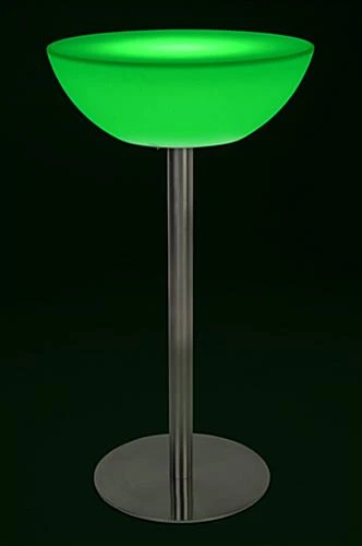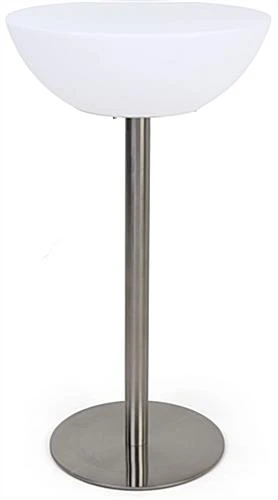 This color-changing LED cocktail table will be the centerpiece of your bar, restaurant, club or event. The round glow top can be switched between 16 different colors and strobing, flashing or fading transitions right from a handheld remote. This half-moon color-changing LED cocktail table is 43″ tall, suitable for standing or adding pub-height stools or chairs. The base is made of durable stainless steel and the round top is made of white translucent polyethylene which allows the light to shine through beautifully. This color-changing bar furniture is a fun aspect to incorporate into your hospitality or event space, switching it up from your average furnishings and creating a glowing conversation piece. This illuminated half-moon LED cocktail table is easy to assemble and holds a 10+ hour charge.