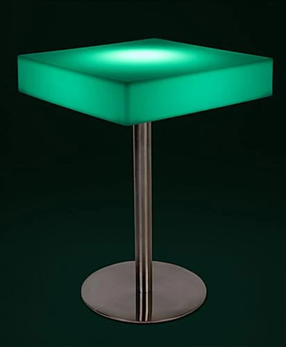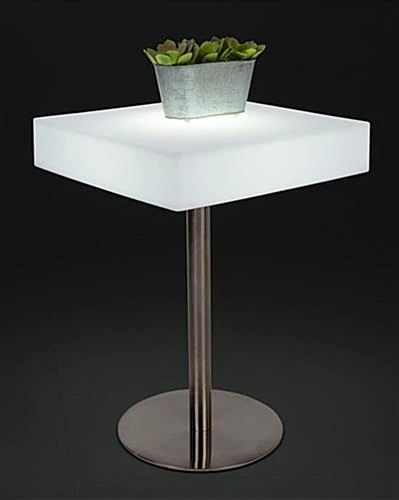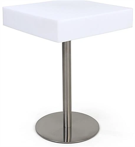 Our square illuminated bar table is a new addition to our LED furniture line and a fun and original way to light-up a dining area or pub at night time. The overall height of this rectangular unit is 34” and the stainless-steel base has a 17.5” diameter. The square illuminated bar table material is made of opaque white plastic and is 23” x 23” with the LED fixture located inside. This light-up item is water-resistant so moisture from cups or accidental spills are nothing to fret over. The color-changing rectangular surface can stay illuminated for 10+ hours before it needs to be re-charged and comes with a wireless remote control to easily manage the 16-hue settings. This LED square illuminated bar table is suitable for indoor or outdoor applications giving a long-lasting glow, turning the ambience up a notch.