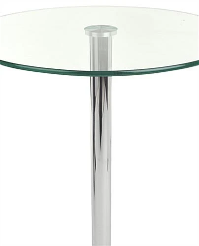 This glass high top table emphasizes fine dining features for a fraction of the price! The tempered panel and the chrome plated aluminum base make this pedestal counter an elegant choice to give rooms a touch of sophistication. This glass high top table, called a bistro dinette, is great for home furnishings as well as special functions such as weddings. Eating is made classy with the leading edge furniture designs that this tabletop delivers. This glass high top table that is for dining has a set height of 36” tall. This pedestal is the ideal stature for standard tabletops. This round dinette, glass high top table has a 24” diameter. Each furniture piece is the ideal size for conversations over coffee in a breakfast nook, for counter space at a wedding reception, or for wine tastings at a restaurant.
