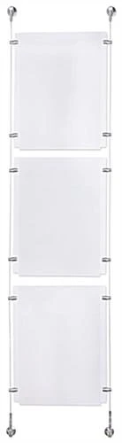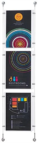 This wallmount poster, also known as cable displays, is perfect for businesses looking for relatively low cost signage that grabs the attention of the customer. This kit includes custom designed satin silver finished hardware for an elegant look to blend well with any environment. This suspended signage kit, wallmount poster includes a crystal clear acrylic panel with a simple to use top-insert design. Users can quickly switch out marketing materials according to business needs. This wallmount poster is part of a large selection of cable kits in all different sizes and configurations. Purchasers can choose a pre-designed set or create a unique matrix by combining multiple different kits.