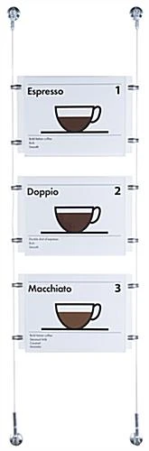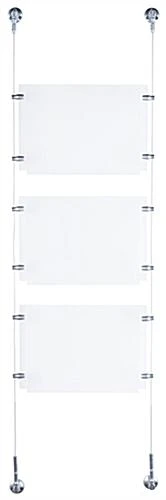 These picture hanging systems, also known as cable displays, are perfect for businesses looking for relatively low cost signage that grabs the attention of the customer. This kit includes custom designed satin silver finished hardware for an elegant look to blend well with any environment. These suspended signage kits, picture hanging systems include a crystal clear acrylic panel with a simple to use top-insert design. Users can quickly switch out marketing materials according to business needs. These picture hanging systems are part of a large of selection cable kits in all different sizes and configurations. Purchasers can choose a pre-designed set or create a unique matrix by combining multiple different kits.