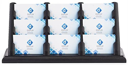 This wooden 9 pocket business card stand offers a contemporary tiered design, perfect for displaying your information in medical offices, law firms, and retail stores. The multiple dividers are great for showcasing an array of professional contacts that people can look through. This wooden 9 pocket business card stand is made of solid oak with a sleek black stained finish to match any interior decor on your desk or counter area. Use this tabletop display to add a more professional, modern presentation to your office. This tiered holder can fit up to 270 standard-sized cards, making it easy to keep it stocked. This solid oak rack is excellent for holding a bulk amount of info, making it convenient for high traffic spaces like restaurants, medical practices, and banks. This black tabletop wooden 9 pocket business card stand is a great way for customers to promptly have the information they need without writing it all down.