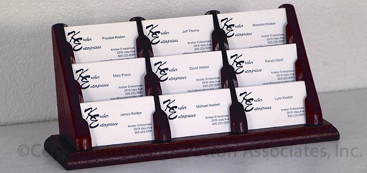 This business card holder was designed specifically for use on a desktop or counter area to display a selection of business cards. The wooden desktop accessory, business card holder features (9) separate pockets to easily differentiate each card, making it easier for customers to find the right one. This business card holder, also known as a business card display, is capable of holding a stack up to 1/2″ thick of cards in each pocket. The business card holder is therefore perfect for use in medical offices, law firms, banks and real estate offices. You can even use the business card holder to display a selection of gift cards or calling cards!