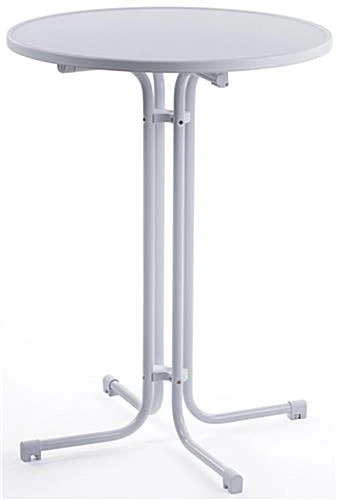 These durable round bar tables, called pub height displays, are white with an MDF [medium density fiberboard] top and steel stand. The high quality construction ensures buyers the highboy will last years of use in high traffic commercial settings. Cocktail displays are round bar tables that are collapsible for storing and transporting around a venue.