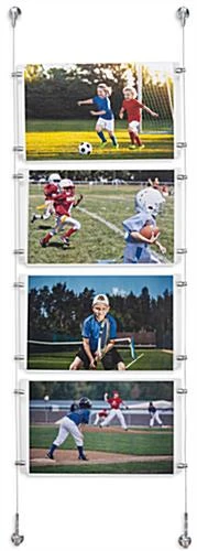 This cable suspension system, also known as cable displays, is perfect for businesses looking for relatively low cost signage that grabs the attention of the customer. This kit includes custom designed satin silver finished hardware for an elegant look to blend well with any environment. This suspended signage kit, cable suspension system includes a crystal clear acrylic panel with a simple to use top-insert design. Users can quickly switch out marketing materials according to business needs. This cable suspension system is part of a large selection of cable kits in all different sizes and configurations. Purchasers can choose a pre-designed set or create a unique matrix by combining multiple different kits.