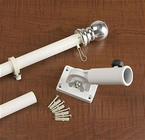 This flagpole is equipped with everything you need to hang a flag outside your business! The flag holder, flagpole measures 5 feet long and includes a wall-mounting bracket. We even provide this flagpole with (4) screws for attaching the bracket to a wall or horizontal surface. This flagpole, also known as a flag pole display, features an adjustable holder to accommodate various-sized flags, windsocks and banners. The flag pole bracket can even change from 0° to 90° in seconds!
