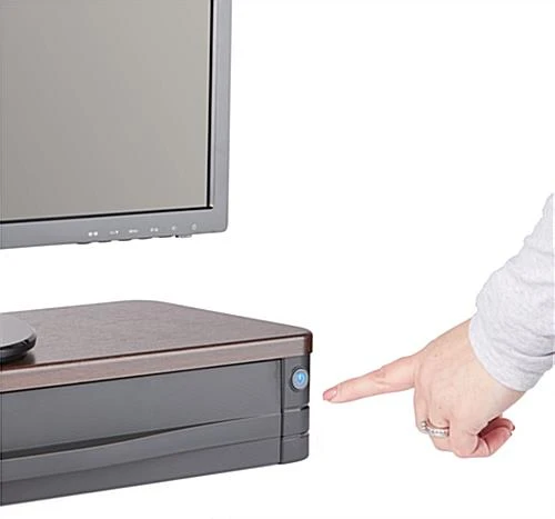 Our UVC disinfecting monitor stand features LED sanitization to clean your keyboard and mouse, eliminating up to 99.9% of bacteria. This versatile product features a faux wood grain finish complimenting the aesthetic of any space. Each fixture is suitable for computer screens up to 27”w, making it the perfect addition to any office or shared workspace. This unit is an efficient cleaning solution for schools, libraries, or offices with multi-user computer stations. This countertop disinfecting monitor stand with LED sanitization has an auto-shutdown light feature, turning off illumination when the chamber door is open. This fixture has a USB-A power cord that allows you the convenience of plugging directly into your technology or any USB charging cube. It also features a 15-minute pre-set feature enabling you to effectively sanitize and clean your keys and cellphone without harsh chemicals or sprays. Our contemporary disinfecting monitor stand comes fully assembled and is a perfect solution for shared workspaces to cleanse high-touch items, ridding them of the germs and bacteria that lurk behind them.