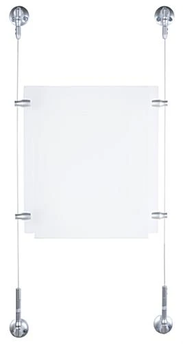 This wall mount sign system, also known as cable displays, is perfect for businesses looking for relatively low cost signage that grabs the attention of the customer. This kit includes custom designed satin silver finished hardware for an elegant look to blend well with any environment. This suspended signage kit, wall mount sign system includes a crystal clear acrylic panel with a simple to use top-insert design. Users can quickly switch out marketing materials according to business needs. This wall mount sign system is part of a large selection of cable kits in all different sizes and configurations. Purchasers can choose a pre-designed set or create a unique matrix by combining multiple different kits.