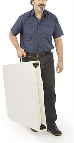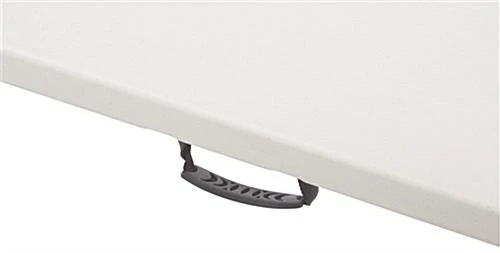 Featuring durable metal legs with a cross bar on each side, this folding table provides maximum strength. The legs of this tabletop each feature non-skid caps to prevent floors from being scratched. This folding table is affordable and incredibly stable when it is fully set-up. This portable furniture conveniently folds together and can be easily carried and stored. Each folding table, like event tables and trade show counters, also comes with an easy grip handle, making it easy to grab and go. The handle remains out of sight when the unit is in use. This folding table will make your next tradeshow experience that much easier prepare for.