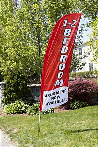 The 1-2 bedroom message flags, called outdoor displays, are specifically engineered for portability for daily use at different locations. Property managers can also take the unit inside at the end of the day to deter theft. Then set up the 1-2 bedroom message flag the following morning. Inside the black nylon carrying bag, there are separate compartments for each component. The 1-2 bedroom message flags have poles consisting of (2) aluminum and (2) fiberglass segments that connect effortlessly, and disassemble in seconds for storage and transport. The pole easily slides onto the ground spike once assembled. Only one person is required for assembly of these 1-2 bedroom message flags that come with an aluminum and carbon pole, making it the ideal tool for real estate agents operating individually. After the showing is finished, the banner fits inside the trunk of any car until the next showing. The 1-2 bedroom message flags for apartments provide agents the maximum in value. Not only is the swooper banner effective at generating inquires on a vacant apartment for rent, but the user-friendly design saves time. In addition to being durable and convenient, this one-two bed room flutter flag is surprisingly affordable and includes everything necessary for placing the unit on a property. No additional base or accessory purchases are necessary to effectively utilize this one-two bed room banner the next time an apartment is available for rent!
