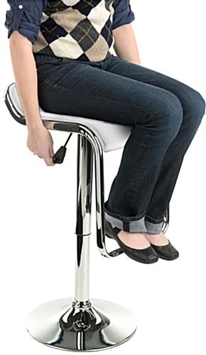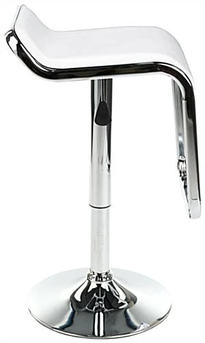 This hydraulic bar stool features a white leatherette cushioned seat and modern chrome plated base. Such a contemporary design is great for trade shows, restaurants, or store fronts. Each modern bar stool features a pneumatic adjustable height ranging from 23โ to 31โ, allowing the unit to move from table to bartop size. A large foot rest and cushion seat ensure a comfortable seated position, great for long days at trade show conventions. The bar stool can also swivel 360ยฐ so users can easily speak with conference attendees from all directions. Pair this modern adjustable height seat with a simple black table to create a contemporary and accessible trade show booth area.
