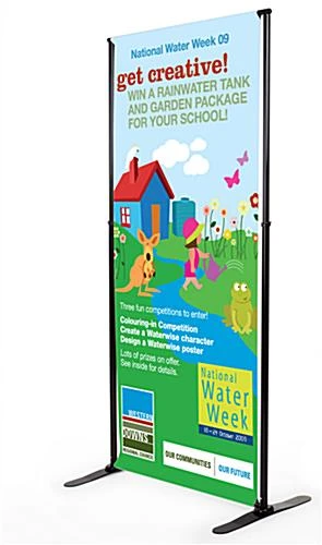 This non-retractable telescoping banner stand that has black finish is an adjustable metal poster holder that is perfect for trade shows. This large display will really set your trade booth apart from other presenters with this large, non-retractable one-sided graphic sign. This telescoping banner stand, also known as a poster display, certainly adds professionalism to your presentation. Use this product on the retail floor, especially in large spaces where small signs can look awkward. A telescoping banner stand like this one is particularly helpful for communicating with potential customers in a high traffic location. Use the single-sided sign holders in a storefront window to pull traffic from off the street. This telescoping banner stand is priced well to provide customers with a complete solution at an affordable cost. Order the custom graphic and holder today!