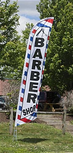 14’ Feather Flag & Ground Spike With Pre-Printed BARBER SHOP Message – Blue & Red