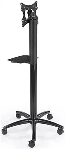 This LED TV stand for floor has a height adjustable design, with (8) set heights ranging from 44″-71-1/5″ to perfectly position a flat screen monitor. The mounting bracket with adjustable extenders accommodates most flat screens between 37” and 65” that weigh less than 110 pounds. The VESA-compatible mount can even display monitors in landscape orientation. Additionally, the mounting bracket on this floor standing unit has a tilting design to angle a monitor up to 15 degrees. This black LED TV stand is equipped with locking wheels for effortless mobility throughout a room. Once the fixture is in place, simply lock the casters to prevent movement.