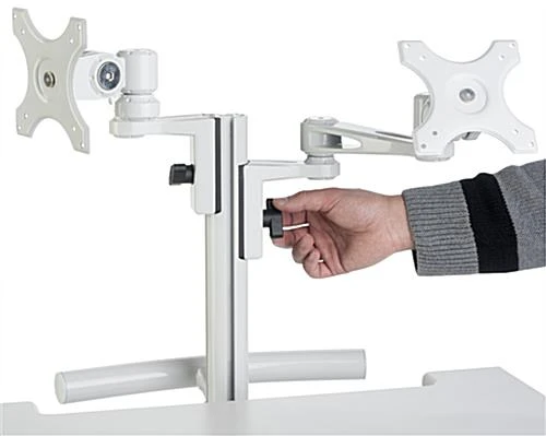 Sit or stand at this dual monitor medical cart by using the foot pedal to easily change the height to your preference. Each mobile computer trolley is built on 4 wheels that allow for full movement between rooms or lock the casters for a stationary solution. Use this healthcare cart in hospitals, doctor’s offices, and labs for an efficient and ergonomic way to work. The two mobile computer workstation mounts are VESA compatible and can accommodate screens ranging from 15” to 23” in size. Additionally, a pull-out keyboard and mouse holder accompanied by integrated cable management make this cart an organized solution for busy offices. This healthcare trolley also totes a large work area that is big enough to hold a 17” wide laptop!