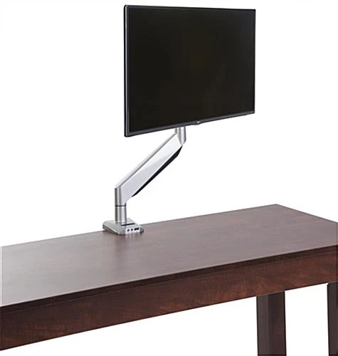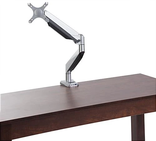 This single monitor arm has a VESA size of 75 x 75 and 100 x 100, great for personal computers. The adjustable desk mount includes grommet and clamp fixtures to fulfill whatever your needs are. The silver monitor arm can fit a screen size of 10”-32”. With the ability to tilt, swivel and rotate, the adjustable desk mount will give you the ability to manipulate the unit for comfortable viewing. The monitor arm features a cable management system to avoid tangling. Confidently affix one screen up to 19.8 lbs. to the support to create a functioning workstation. Also featured on the stand base is a USB port, microphone and headphone jack to cater to your needs.