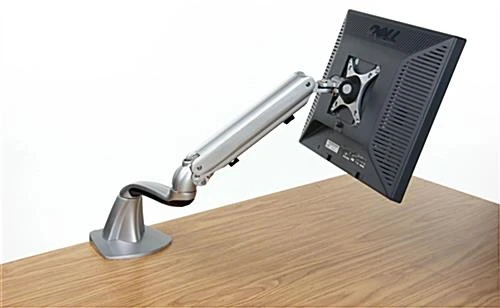 This gas spring desk monitor mount, also known as an LCD table stand, is constructed of durable aluminum. The built-in tension gauge assists in moving the computer or flat screen. Each silver desk monitor mount is sleek and saves space on the table surface. This LCD display allows users to adjust the screen to the most comfortable viewing level. The flat screen stand shown here comes with mounting hardware, but the customer is responsible if the monitor requires special screws. This gas spring arm assists in reducing clutter on any table top. The clamp method is ideal for those who do not want to alter the counter by drilling a hole. These flat screen holders are durable and designed to last.