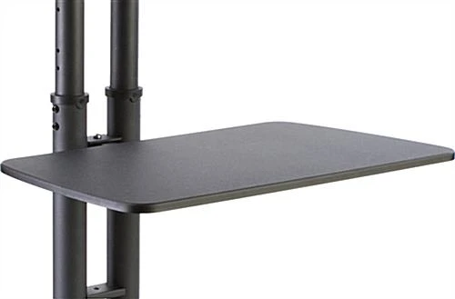 This double sided TV stand fits (2) flat-screen monitors between 32” and 65” that weigh less than 220 pounds together. The adjustable mounting brackets are compatible with VESA mounting patterns up to 800×600 and will therefore fit most brand names and models. This double sided TV stand is height adjustable with 8 set heights between 55 and 83 inches up from the ground. The telescoping design of the posts allow for effortless setup and adjustments. The hollow posts also make it possible to keep a professional and clean appearance as wires and cables may be hidden within the poles. This double sided TV stand is sold with a 28-inch display shelf, which is perfect for hold AV equipment or promotional materials. Locking wheels are also provided, which make the stand mobile. Once positioned in a desired spot, simply lock the wheels to prevent movement.