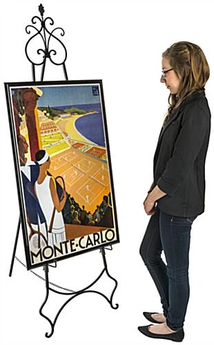 This adjustable wrought iron easel provides two designated holders to display art simultaneously. Including two sets of height modifiable hooks, these decorative display stands can accommodate one large portrait or multiple paintings at once. Showcase an event poster, artistic painting, keynote speaker announcement or informational sign on the ornate floor standing easel. To better inform you in preparation for a presentation, the bottom hook set provides a height range of 10.5″ – 33.5″, while the top hook set ranges from 35″ – 55.5″. Designed with a scroll design decorative topper, these display stands are sure to make a stylish impression no matter what décor it is placed into. Sturdy, yet lightweight, each easel easily collapses and can be carried without hassle. Equipped with a safety chain, these holders offer a durable way to exhibit artwork meant for indoor use, that is sure to attract attendee’s attention!