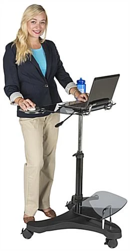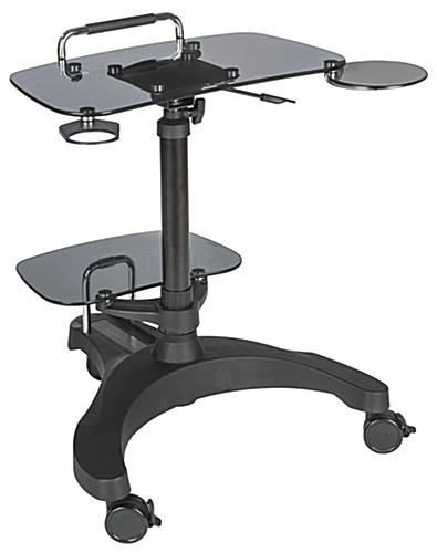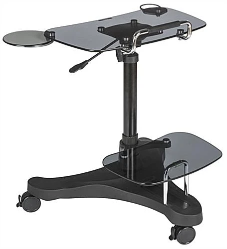 This sit to stand rolling workstation offers an elegant yet ergonomic design that suits any home or office setting. Featuring 2 tempered glass surfaces on a polypropylene base, this computer cart provides a durable surface for your electronics. Each adjustable height rolling workstation has a pneumatic gas spring lift triggered by a lever to easily raise or lower the ergonomic glass surface. Store your compact printers, fax machines, or other small electronics on the lower shelf. Organize and power your electronics with the built-in slot that secures a surge protector strip with hook and loop adhesives to the base of this all-in-one cart. If you desire portability the 3 casters unlock for smooth mobility in your home or business, then lock for a stable surface. For your comfort, a retractable mouse tray and a cup holder attach below the glass platform and can be easily modified for left or right handed users. Easy and quickly assemble this rolling workstation with an adjustable height shelf for immediate use!