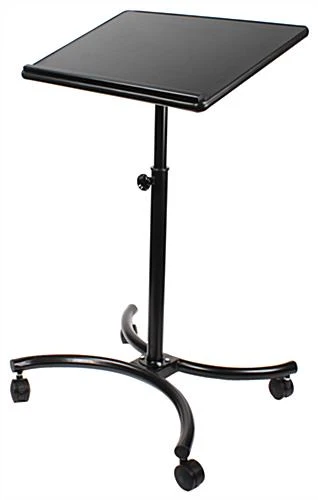 These stands have a lip at the bottom of each surface to prevent items from sliding off. This mobile laptop desk that has locking casters is constructed from sturdy steel with a matte black finish. The surface board is made from MDF and looks great in any setting. This tilting mobile laptop desk provides plenty of room for a presenter to keep a laptop and important notes at hand. Use this display at home as well! Use this computer stand, mobile laptop desk in a personal office setting. The height adjustability and tilting design make it easy to adjust this stand for ergonomic efficiency. Increase productivity and utilize a wide range of space with this mobile laptop desk.