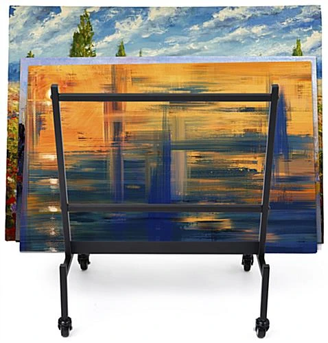 This print storage rack can hold up to (50) 24″ x 36″ art protectors, perfect for showcasing a variety of artwork at museum shops, galleries, fairs, and festivals. The heavy-duty construction and black powder-coated finish ensure it will last through years of use. This steel mobile print storage rack for art includes two durable locking casters, ideal while displaying your work in high traffic areas. The single bin is an excellent way to remain organized and professional while making artwork more accessible. Our sleek black stand includes all necessary hardware and tools to assemble within minutes. Use this mobile steel print storage rack with locking casters to not only keep photography and paintings crease-free but to draw the attention of customers passing by during markets and fairs.