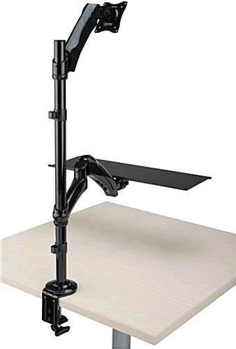 Using a pre-existing desk to offer a lower price, this sit stand monitor arm offers both health and productivity benefits. The computer workstation features a tray and bracket extension that moves independent of one another, both for height adjustment and swiveling. Supporting an LCD screen weighing up to 17.6 lbs, this heavy-duty monitor arm can be secured to a flat surface using the base either as a clamp or a grommet. The bracket tilts and rotates, ensuring easy viewing at any height while reducing neck strain. The extension fits both 75×75 & 100×100 VESA sizes for a 13”-27” LCD screen. Using a gas spring design, this workstation easily adjusts along the pole without needing tools. Use this monitor arm as an affordable and space-saving option compared to other computer desks on the market.