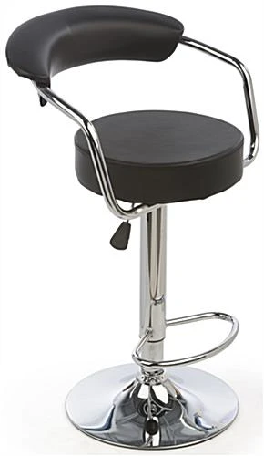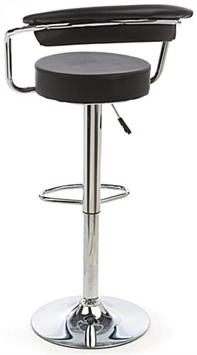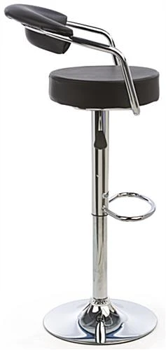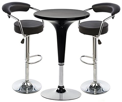 This black hydraulic bar stool and table set arrives at your door as a complete furniture collection, ready for immediate use in a restaurant, retail store, or trade show booth. Two faux leather seats feature open back designs, while still providing a supportive backrest area. Each piece of the modern stool and table set is height adjustable with internal pneumatic lifts. Easily adjust this unit for use with multiple sizes of furniture. The plastic tabletop of the stool and table set rotates 360°, as do each of the high quality seats, an excellent feature for social environments such as trade shows. A perfect combination of form and function, this collection is practical, light weight, easy to use, and contemporary.
