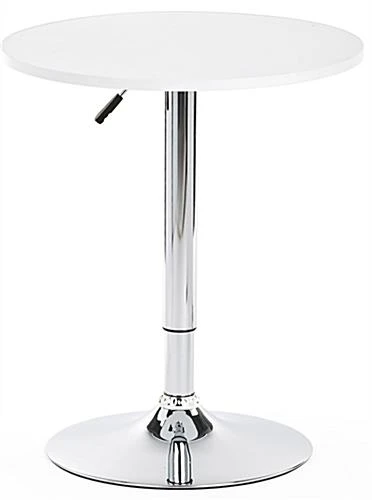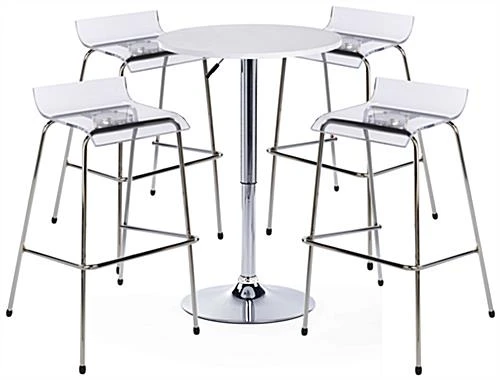 This white bar table and chair set comes with 4 plastic and steel stools and 1 highboy. The seats are stackable, offering a great storage option for restaurants and cafes. Each high quality table and chair set is also ideal for trade show exhibit booths. For comfort during long conventions, these seats have small backrests and foot rests. Arrange the table and chair set in such a way that will invite passing trade show attendees to stop and talk! A high quality pneumatic furniture mechanism makes it possible to adjust the height of the highboy with ease.
