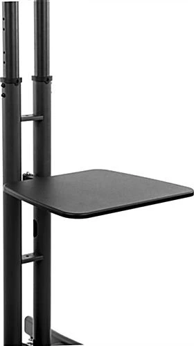 This double sided TV stand has 2 separate mounting brackets for displaying flat screen monitors back to back. Each bracket is compatible with VESA mounting standards, fitting most brand names and models between 32” and 65”. This double sided TV stand is equipped with a small, 19-inch display shelf for holding presentational supplies, such as AV equipment or promotional literature. Locking wheels are also provided for effortless mobility throughout a room. While in use, feel free to lock the wheels to prevent movement. This double sided TV stand with shelf is height adjustable, with an easy-to-use telescoping post and 8 set heights. The poles are also hollow, thus allowing users to feed wires down to the base to create a cleaner appearance.