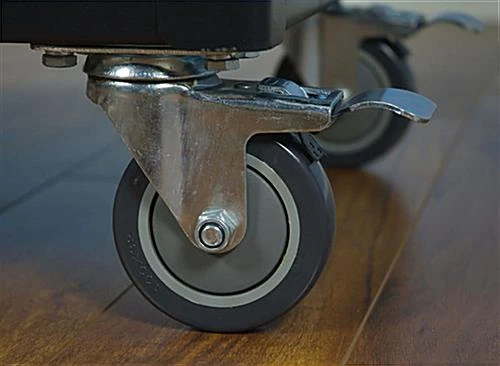 This flat screen cart can support up to an 80” monitor. Utilize this mobile panel mount for oversized and large plasma TV’s. Designed with 2 curved handles to protect the widescreen LCD, both attachments also provide maneuverability for the screen cart. Durable steel construction with a black powder coated finish creates a mobile panel display that will withstand extended use and an extra large wide top shelf for presentation materials. Equipped with a cord winder and a 15’ power strip with 4 outlets, the cart allows for ideal positioning whether in a classroom or conference room. Each LCD mount is affixed to a dual post and includes a tilting bracket. Stow away additional audio video equipment within the locking storage cabinet. Freely transport your large monitor with each mobile panel display including 4 swivel casters (2 locking) from one location to the next.