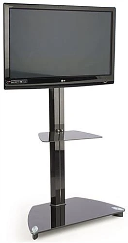 This flat TV stand with mount has an adjustable black tempered glass device shelf that is perfect for holding cable boxes, DVD players, or game systems. Each fixture features a modern design that is sure to complement your existing decor. The large monitor TV stand also has adjustable arms that allow you to angle your television up or down for the best view. The steel bracket can hold a 37″ to 70″ plasma or LED screen, weighing less than 110 lbs. Additionally, the stand features a heavy glass base with a unique trapezoid design, along with rubber feet to prevent scuffing. Ideal for home or high class retail use, this monitor holder with device shelf adds style to any establishment.