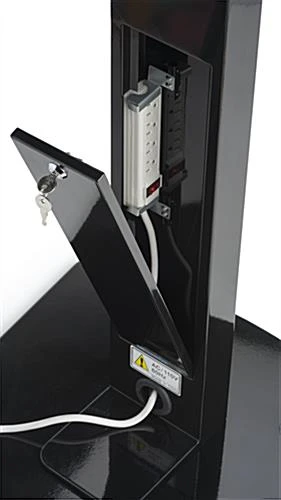 Use our LCD monitor floor stand to create an interactive kiosk for your touch screen displays. Complete with two mounting brackets, these units can safely hold flat panels ranging from 10” to 60”. Additionally, the black LCD monitor floor stand has a flat base for stability with two casters in a tilt-and-roll design that allow for easy mobility. A lockable compartment located on the back of the kiosk encloses an opening for the included surge protector as well as other cables. The easy loading brackets allow you to install an LCD monitor onto the unit without hassle. Use this screen display stand in your store, school, lobby or other high traffic area to offer direction or showcase promotions on an interactive flat panel.