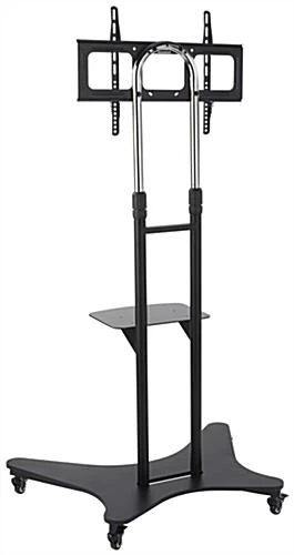 This mobile TV console is great to bring to a trade show for its light weight and versatility in monitor size. Standing at 67.5” off of the ground, this bracket is an ideal, mid-sized fixture. This rolling TV console features four locking caster wheels that help to effortlessly transport the bracket to different locations and secure it in place to ensure that the expensive mounted LCD screen is safe. Each entertainment center can withstand a maximum load of 180lbs which typically holds 37” to 70″ flat panel monitors. This TV console features a height adjustable bracket between 64” and 67.5” as well as a shelf that can be fixed between 23” and 27” off of the floor and can hold media such as laptops, DVD, and VCR players. Each flat panel cart has a VESA standard compatibility range between 200×200 and 600×400, including most other common sizes between these two.