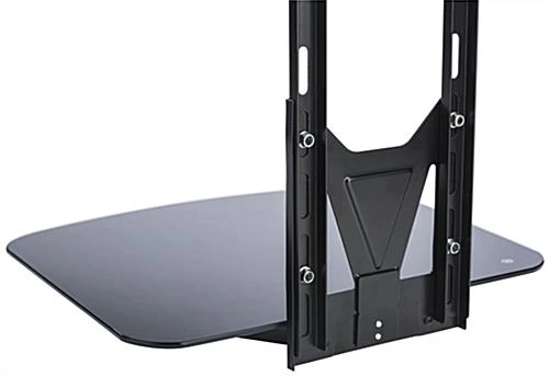 This TV wall mount with floating glass shelf is a stylishly designed flat panel holder made from steel and features a tempered pane! The metal bracket and ledge can be used to hold cable boxes, DVD players, or other digital equipment. Each flat panel mount can be used in homes, office buildings, retail outlets and more. The steel bracket accommodates screens that measure between 32” and 55” while weighing no more than 99 lbs. Black powder coated metal adds to the style of your existing environment while providing durability that will last. Additionally, the mount and tempered ledge can hold players and other accessories up to 29 lbs.