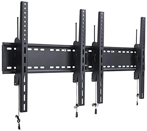 Showcase a seamless dual display above your checkout area with this 2-monitor wall portrait TV bracket. Complete with steel construction and a black finish, this flat panel holder was made for long lasting use. Varying degrees of tilt allow the versatile wall portrait TV bracket to adjust on a whim without the use of tools. Hang a series of dual display flat panels to create a virtually borderless large viewing screen. Proudly showcase advertisements or business information to passersby in universities, stadiums, restaurants, and more. Each portrait TV bracket, featuring ten to fifteen degrees of tilt, comes with the necessary hardware to hang the fixture as well as many popular models of screens.