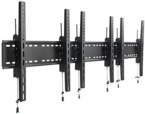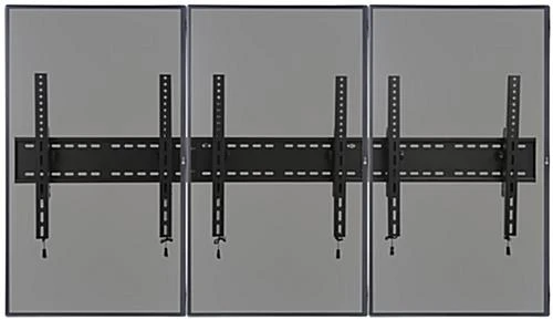 Supporting a multi screen setup, this 3-monitor wall portrait TV mount can create a seamless large display. With VESA compatibility this fixture can support LCD, LED, and most other popular television types. Additionally, the steel wall portrait TV mount can hold up to a combined 264lbs to ensure your flat panels are kept secure. Each multi screen setup is perfect for showing menu items in bars, arrival times in airports, or maps and class information in universities. The VESA brackets can tilt your LCD or other panel between 10° – 15° and be removed from the back plate with a quick pull and lift from the release cable. Showcase multiple messages at once with use of this portrait TV mount which can support screens ranging from 30” to 60”.