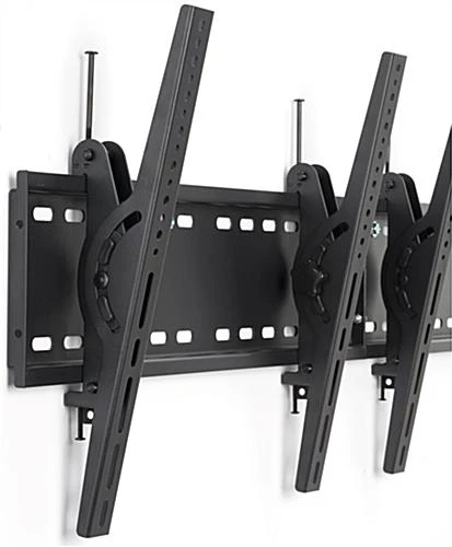 Showcase menu items, merchandise, or important information on digital displays with this 4-monitor wall bracket. The black mounting arms are capable of holding four screens with a maximum capacity of 354lbs and sizes ranging from 30” to 60”. Each VESA compatible wall bracket can accommodate most modern flat panels with the included hardware. Tiltable mounting arms offer a pleasing view to passersby with the ability to adjust the view without having to dig out your tool box. Additionally, the brackets can move across the black backing to align your display’s borders for a seamless look. Modernize your business with this television fixture that allows you to showcase custom menus, advertisements, or customer needed information.