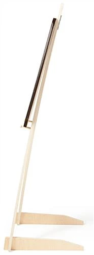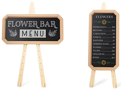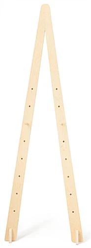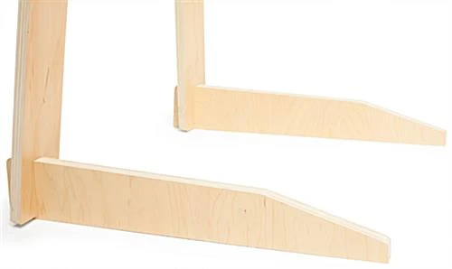 Our folding display easel is a modern collapsible design ideal for showcasing advertising signs and art prints in retail stores, boutiques, museums, and exhibit galleries. This wooden bi-fold floor stand is constructed of a durable poplar wood core with an eco-friendly natural wood laminate finish that can endure the damaging effects of a busy shopping environment and holds signage weighing up to 20 pounds. Each display easel with multi-tiered design includes eight adjustable notches on each side of the frame ranging from 12″ to 47″ in height. This floor-standing wood fixture includes four three and a half-inch pegs with a lip to securely keep different sized signs, boards, and artwork in place. Intended for temporary setups like pop-up shops and market booths, each lightweight display easel with collapsible design quickly assembles and disassembles within minutes. Assembly is a two step process – simply interlock the triangular frame onto the included legs, insert the adjustable wood pegs into the notches located on the frame, and watch this fixture take its shape. Pair this wooden bi-fold floor stand with coordinating eco-friendly chalkboard fixtures (sold separately) for a captivating showcase that grabs your audience’s attention!